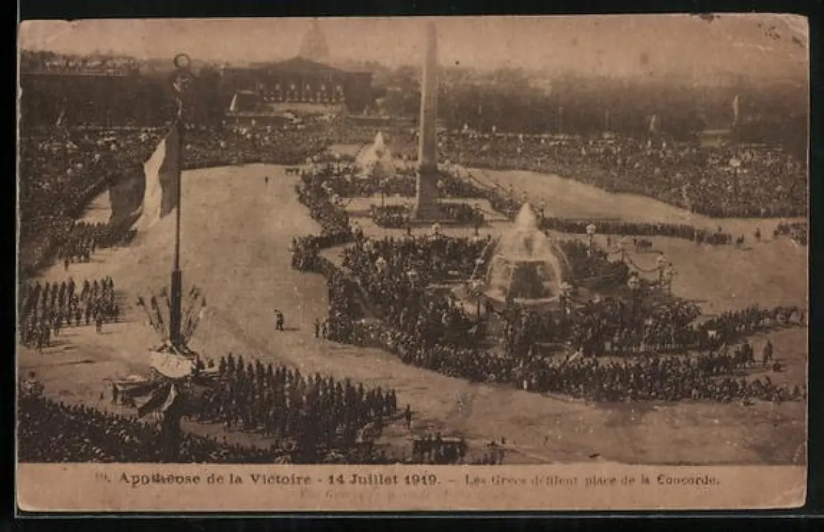 AK Apotheose de la Victoire, Les Crècs défilent place de la Concorde, Siegesparade / Fete de la Victoire 1919