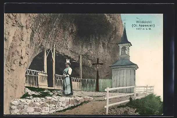 AK Appenzell, Frau in Tracht am Wildkirchli