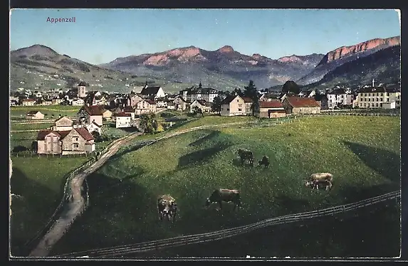 AK Appenzell, Ortsansicht mit Landstrasse, Kühen und Bergpanorama