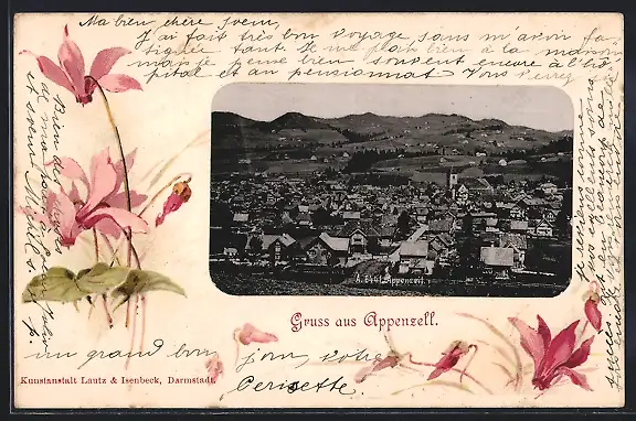 AK Appenzell, Stadtansicht im Alpenveilchen-Passepartout