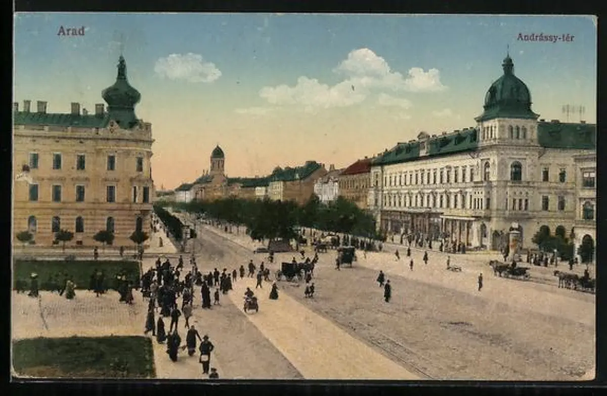 AK Arad, Andrassy-ter, Strassenleben m. Pferdekutschen & Litfasssäule