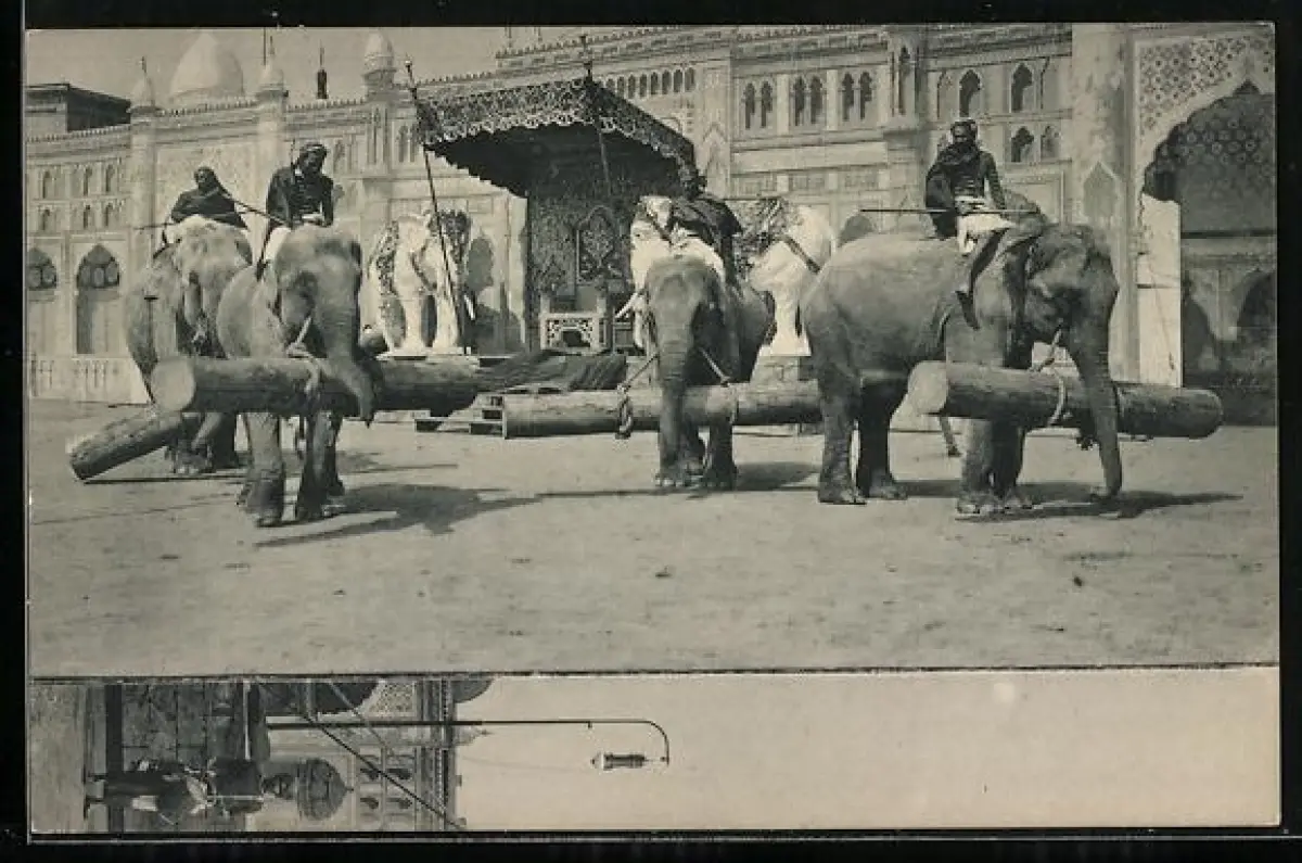 AK Arbeitselefanten mit Holzstämmen u. Sänfte vor einem Palast
