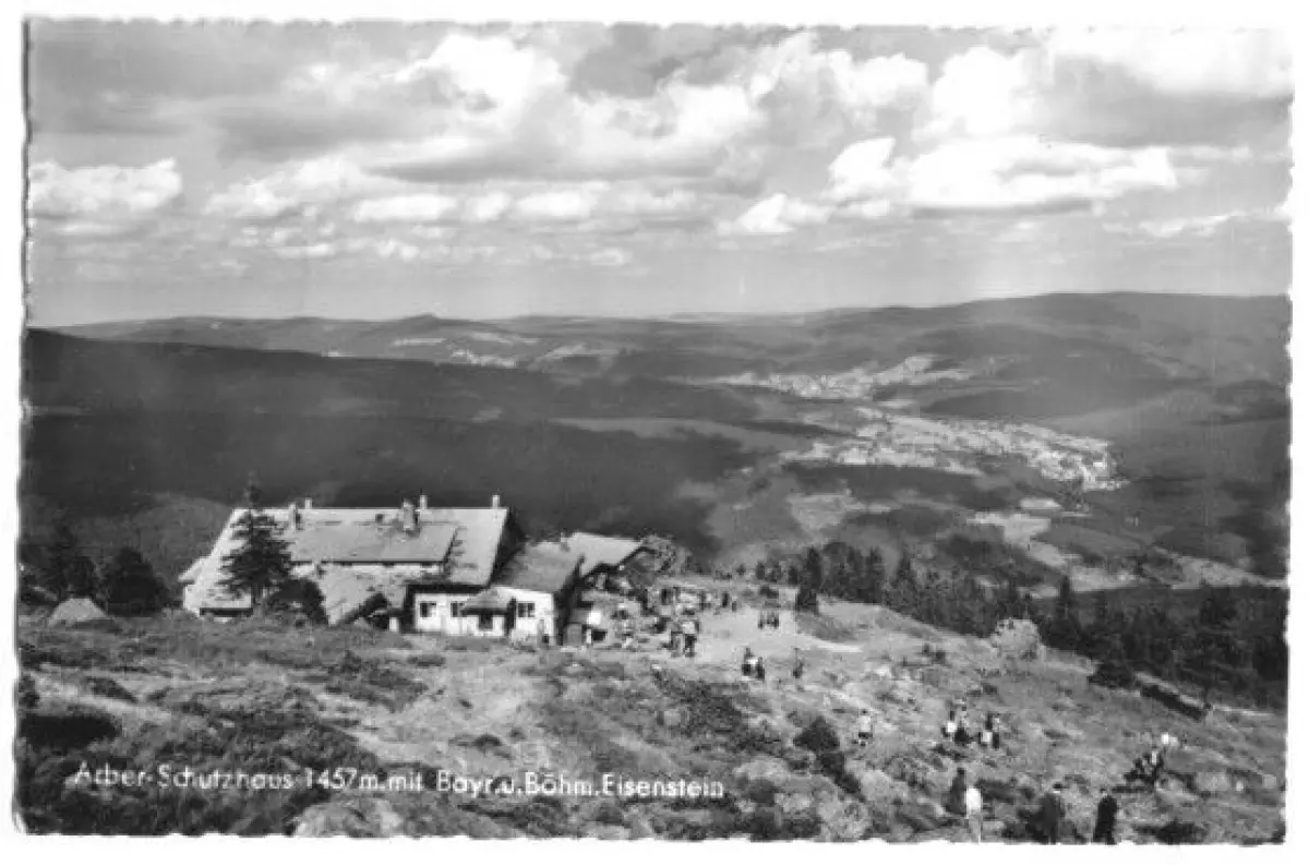 Ansichtskarte Arber-Schutzhaus mit Bayer. und Böhm. Eisenstein    Erhaltung I-II, Marke entfernt postalisch gelaufen, gestempelt: unleserlich [26.6.62] Verlag: Heinrich Steinmann, Cham