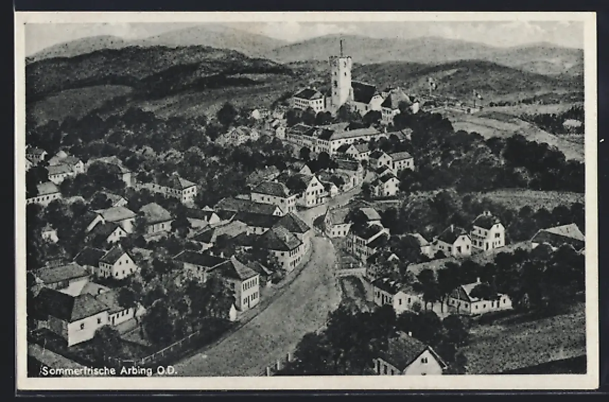 AK Arbing, Ortsansicht mit Burg und Gebirgspanorama