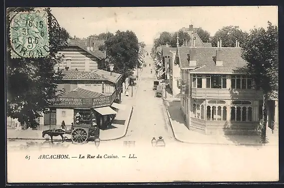 AK Arcachon, La Rue du Casino avec calèche et bâtiments historiques