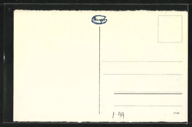 Personenbezogene Daten auf der Rückseite der Karte wurden durch blauen Textmarker unkenntlich gemacht. Die blauen Stellen sind auf die Vorderseite durchgeweicht und wirken sich negativ auf das Postkartenfoto aus