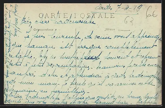 Personenbezogene Daten auf der Rückseite der Karte wurden durch blauen Textmarker unkenntlich gemacht. Die blauen Stellen sind auf die Vorderseite durchgeweicht und wirken sich negativ auf das Postkartenfoto aus