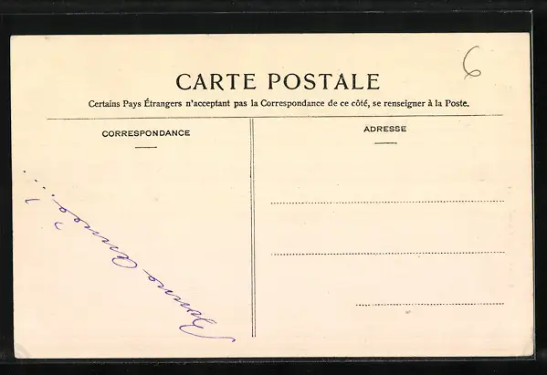 Personenbezogene Daten auf der Rückseite der Karte wurden durch blauen Textmarker unkenntlich gemacht. Die blauen Stellen sind auf die Vorderseite durchgeweicht und wirken sich negativ auf das Postkartenfoto aus