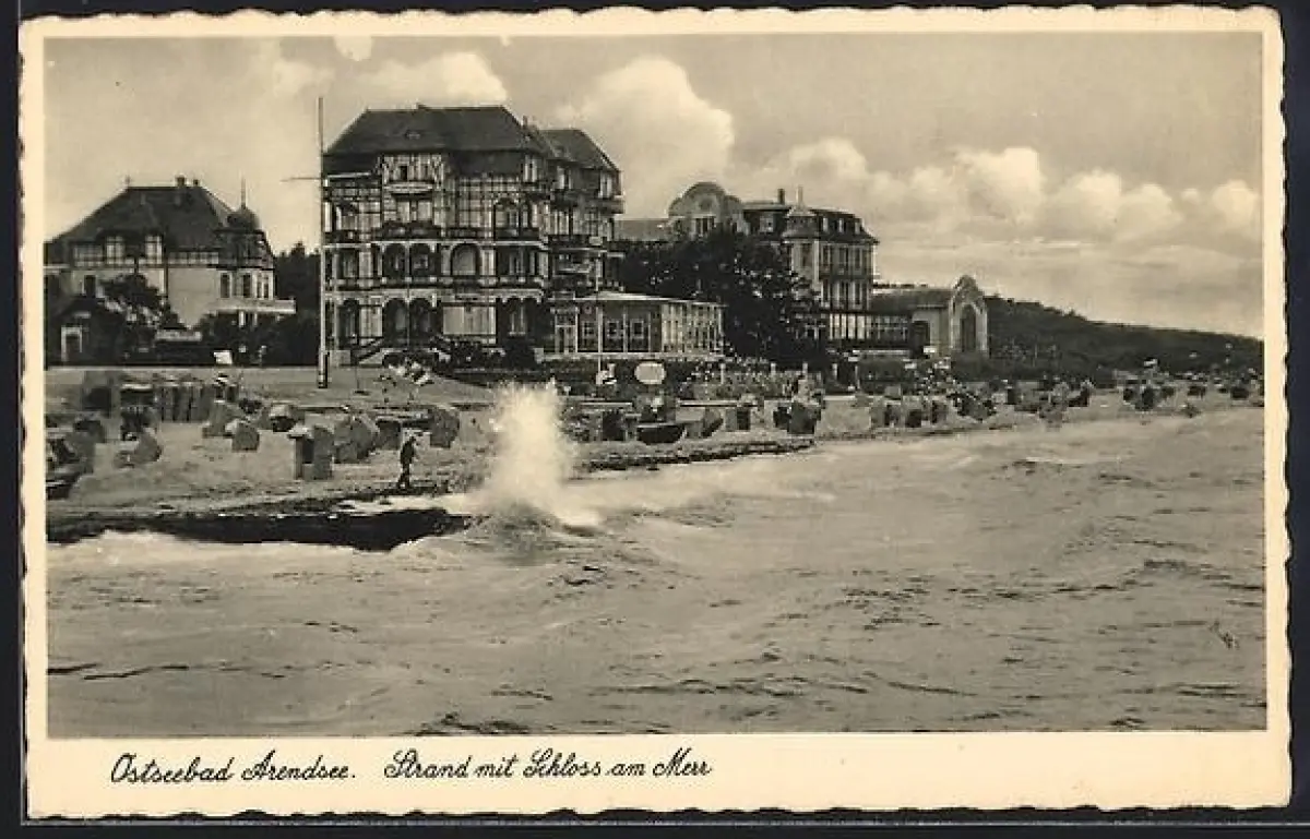 AK Arendsee / Ostsee, Strand mit Hotel Schloss am Meer