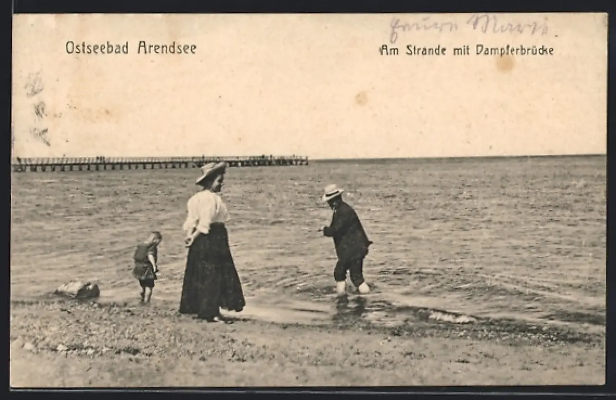 AK Arendsee / Ostseebad, Am Strand mit Dampferbrücke