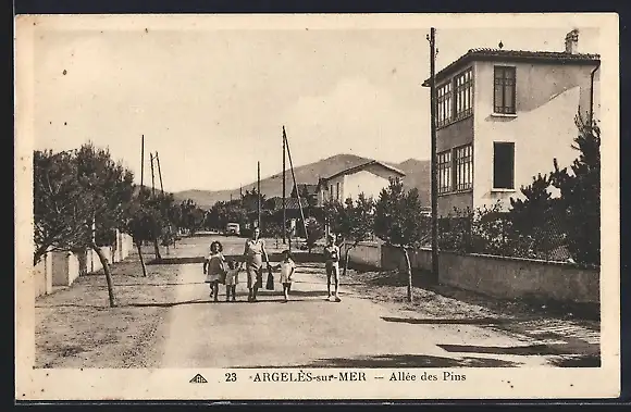 AK Argelès-sur-Mer, Promenade sur l`Allée des Pins avec enfants et maisons en arrière-plan