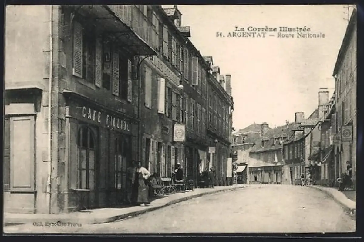 AK Argentat /Corrèze, Route Nationale et Café Pitouil en ville animée