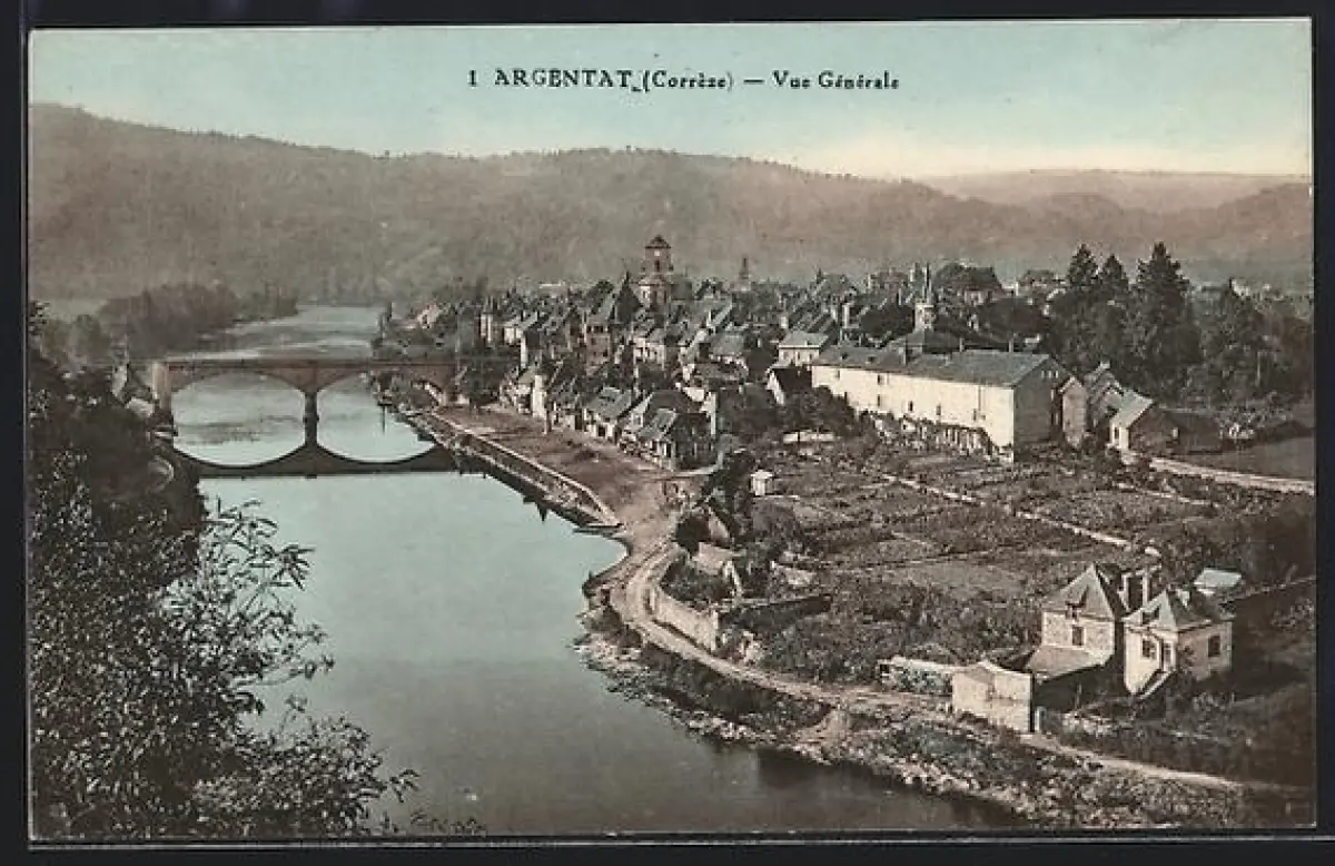 AK Argentat /Corrèze, Vue générale du village et de la rivière avec pont et collines en arrière-plan