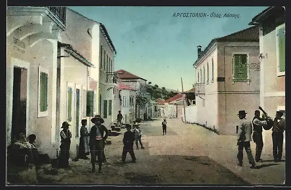 AK Argostoli, Strassenpartie in einer Wohnsiedlung mit spielenden Kindern