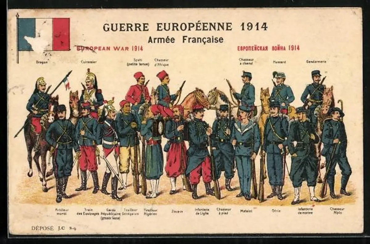 AK Armée Francaise, Guerre Européene 1914, Uniformen der französischen Armee, Infanterie