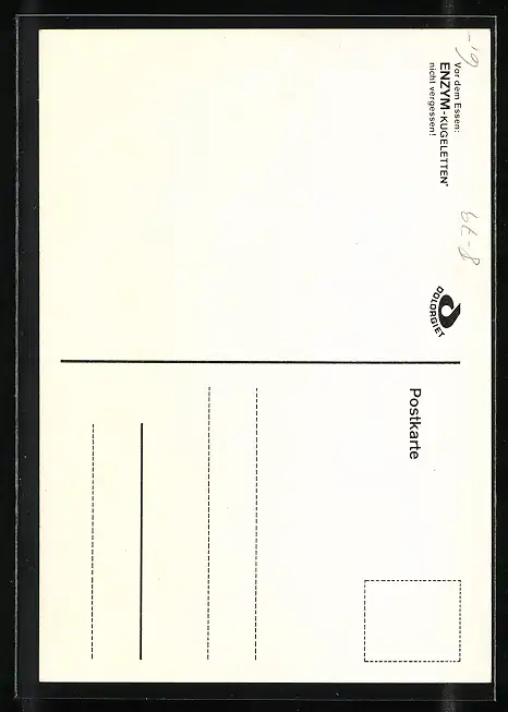Personenbezogene Daten auf der Rückseite der Karte wurden durch blauen Textmarker unkenntlich gemacht. Die blauen Stellen sind auf die Vorderseite durchgeweicht und wirken sich negativ auf das Postkartenfoto aus