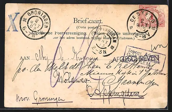 Personenbezogene Daten auf der Rückseite der Karte wurden durch blauen Textmarker unkenntlich gemacht. Die blauen Stellen sind auf die Vorderseite durchgeweicht und wirken sich negativ auf das Postkartenfoto aus