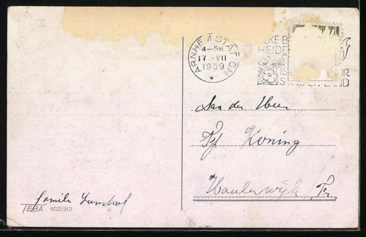 alte Ansichtskarte, gelaufen 1939, Briefmarke entfernt, rückseitig Oberflächenschaden, Eckknicke unten, guter Zustand