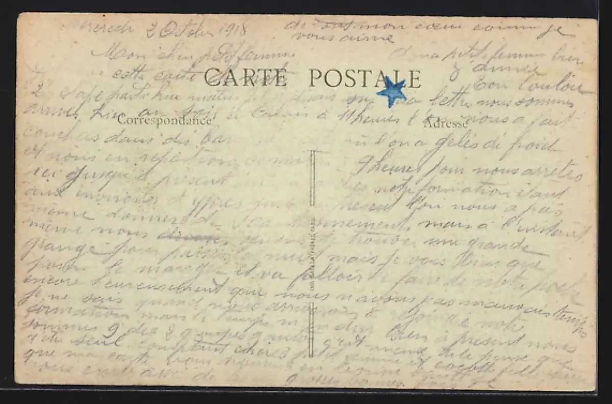 Personenbezogene Daten auf der Rückseite der Karte wurden durch blauen Textmarker unkenntlich gemacht. Die blauen Stellen sind auf die Vorderseite durchgeweicht und wirken sich negativ auf das Postkartenfoto aus