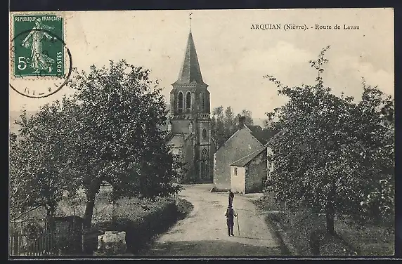 AK Arquian, Route de Lavau avec église et chemin champêtre
