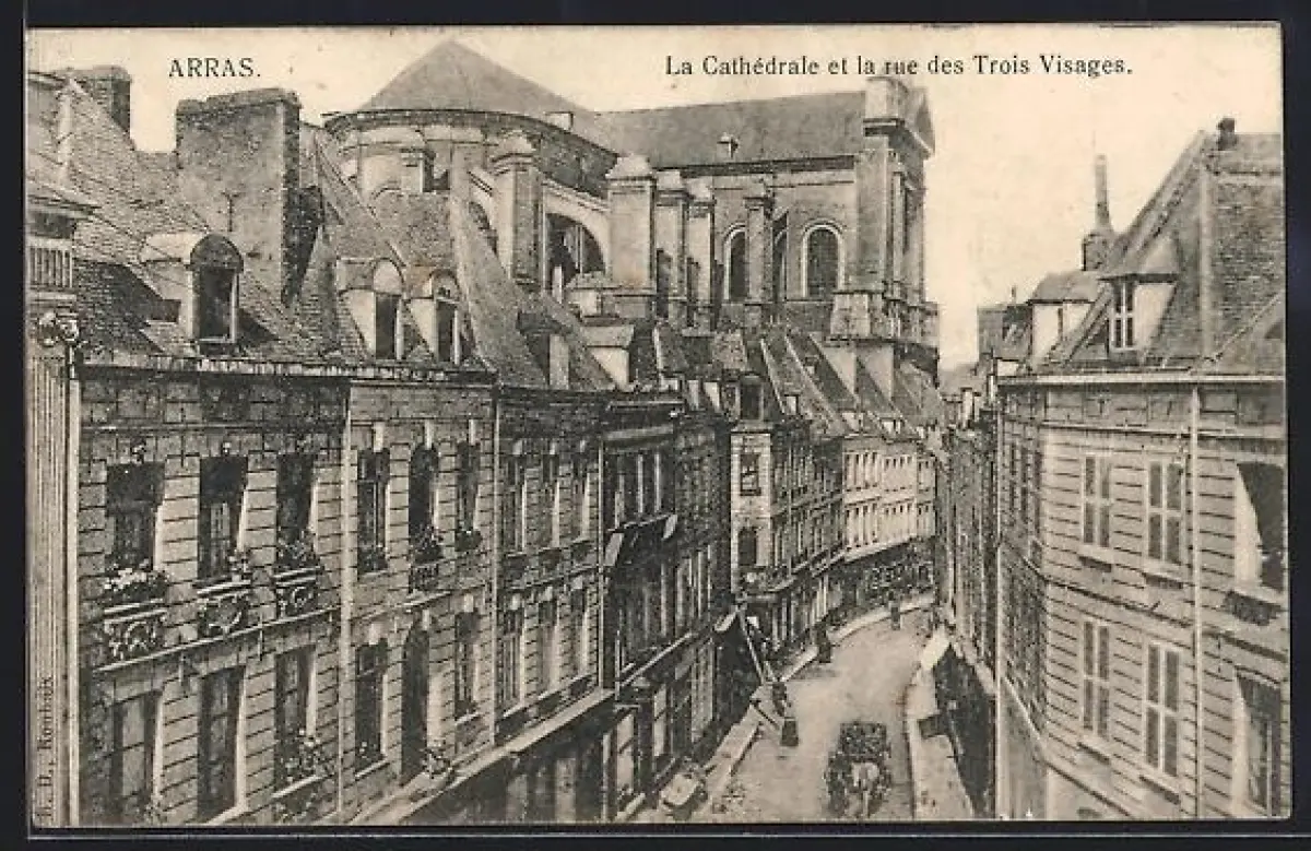 AK Arras, La Cathédrale et la rue des Trois Visages