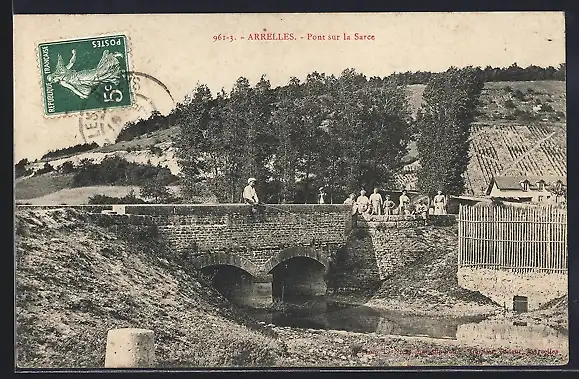 AK Arrelles, Pont sur la Sarce avec des passants sur le pont et paysage rural en arrière-plan