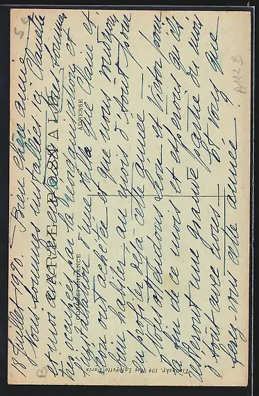 Personenbezogene Daten auf der Rückseite der Karte wurden durch blauen Textmarker unkenntlich gemacht. Die blauen Stellen sind auf die Vorderseite durchgeweicht und wirken sich negativ auf das Postkartenfoto aus