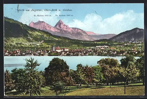 AK Arth am Zugersee, Teilansicht mit Ober-ARth und Goldau, Kl. Mythen und Gr. Mythen