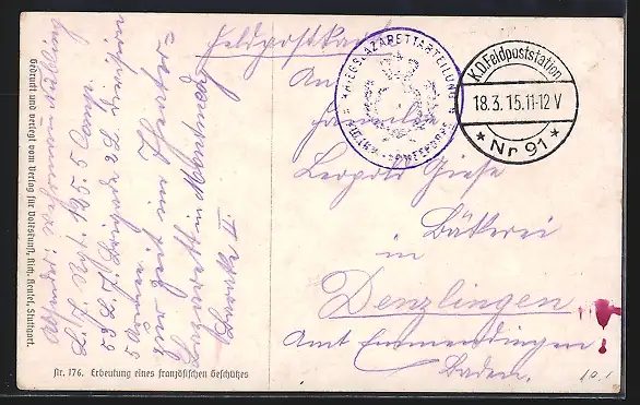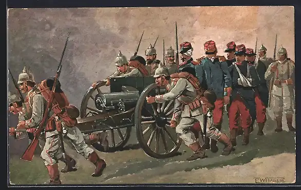 AK Artillerie wird in Stellung gebracht, Kriegsgefangene weggeführt