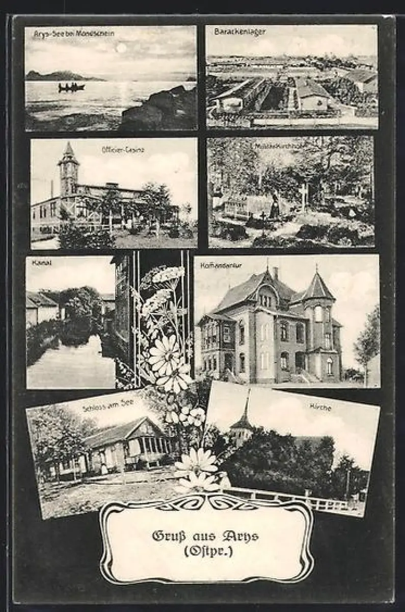 AK Arys /Ostpr., Arys-See, Kommandantur, Schloss am See, Kirche, Militärkirchhof, Barackenlager