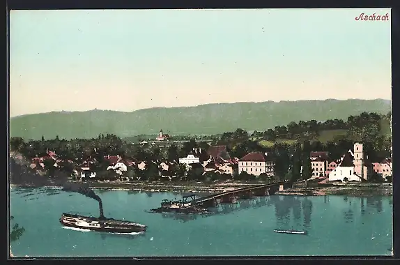 AK Aschach, Ortsansicht mit Anleger und Dampfer