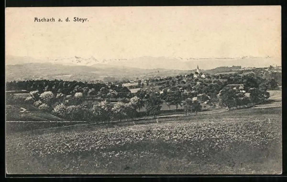 AK Aschach a. d. Steyr, Ortspanorama mit Bergen