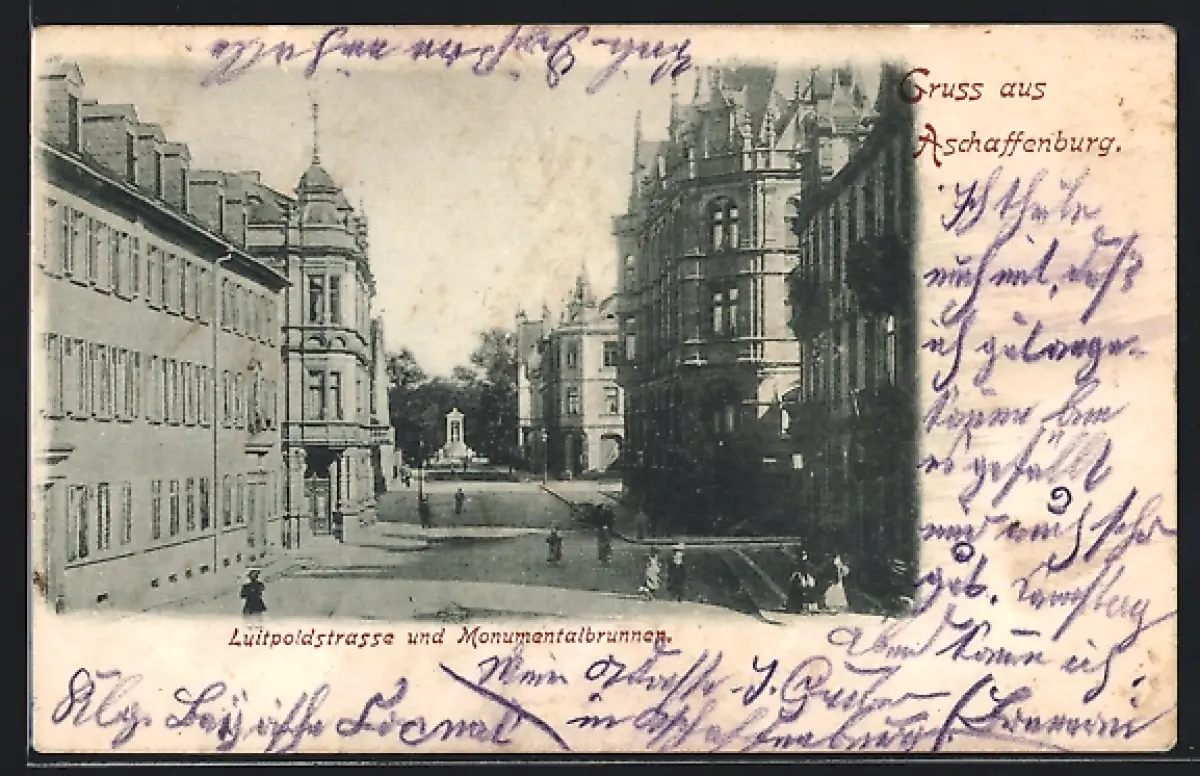 AK Aschaffenburg, Luitpoldstrasse und Monumentalbrunnen
