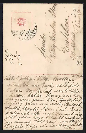 Personenbezogene Daten auf der Rückseite der Karte wurden durch blauen Textmarker unkenntlich gemacht. Die blauen Stellen sind auf die Vorderseite durchgeweicht und wirken sich negativ auf das Postkartenfoto aus