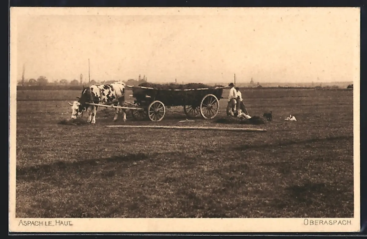 AK Aspach-le-Haut /Oberaspach, Scène rurale avec charrette à boeufs dans les champs