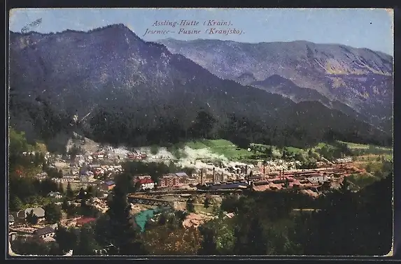 AK Assling-Hütte /Krain, Totalansicht mit Bergpanorama aus der Vogelschau
