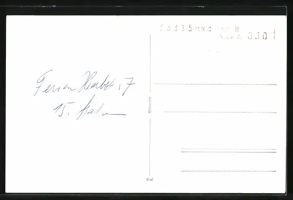 Personenbezogene Daten auf der Rückseite der Karte wurden durch blauen Textmarker unkenntlich gemacht. Die blauen Stellen sind auf die Vorderseite durchgeweicht und wirken sich negativ auf das Postkartenfoto aus