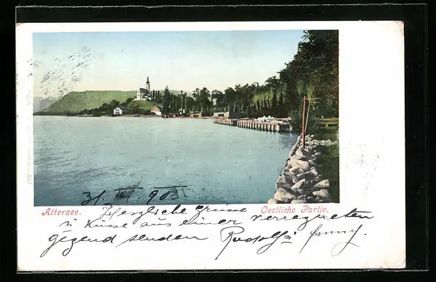AK Attersee, Uferpartie von Osten mit Blick zur Kirche