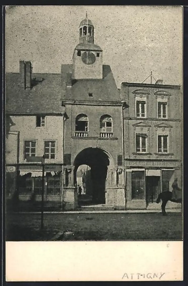 AK Attigny, Vue de la porte d`entrée avec horloge et bâtiments adjacents
