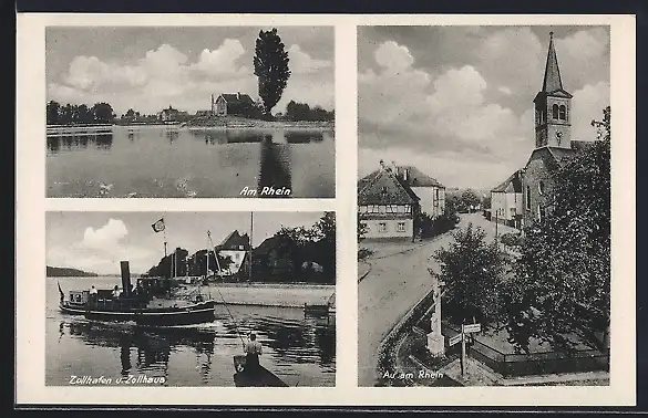 AK Au / Rhein, Zollhafen und Zollhaus mit Rhein-Dampfer, Ortspartie mit Kirche