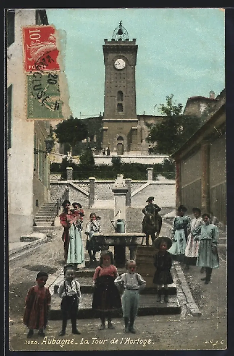 AK Aubagne, La Tour de l`Horloge avec des habitants devant une fontaine