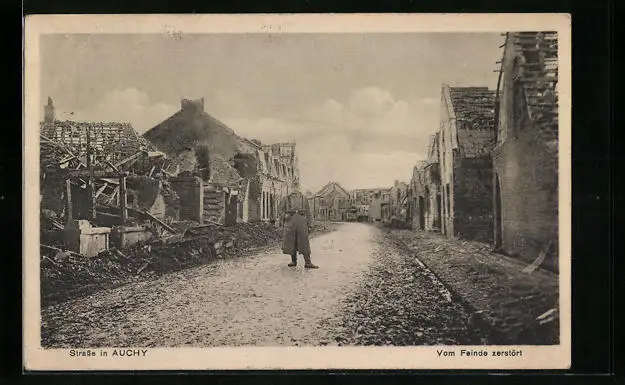 AK Auchy, Strasse mit Soldat, Vom Feinde zerstört