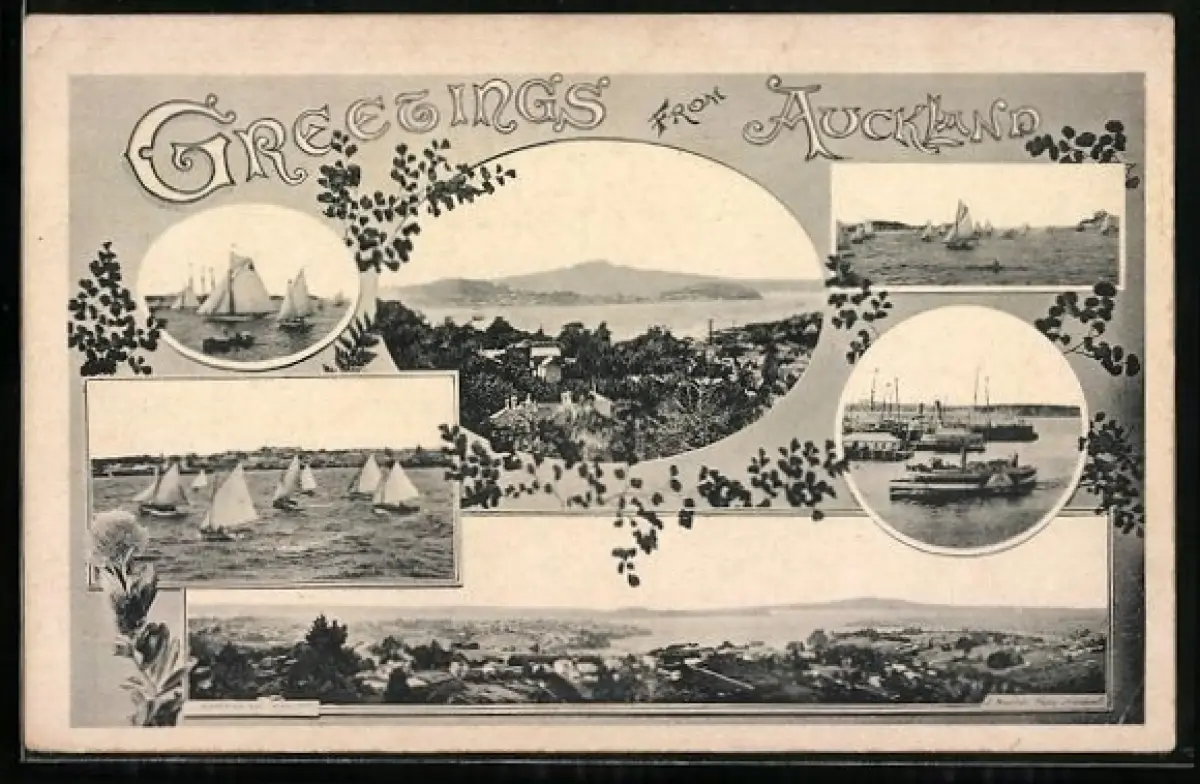 AK Auckland, Panorama, Segelboote u. Dampfer in Fahrt
