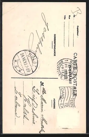 gelaufen 1913, Briefmarke entfernt, rückseitig Oberflächenschaden, Eckknick li. unten, guter Zustand