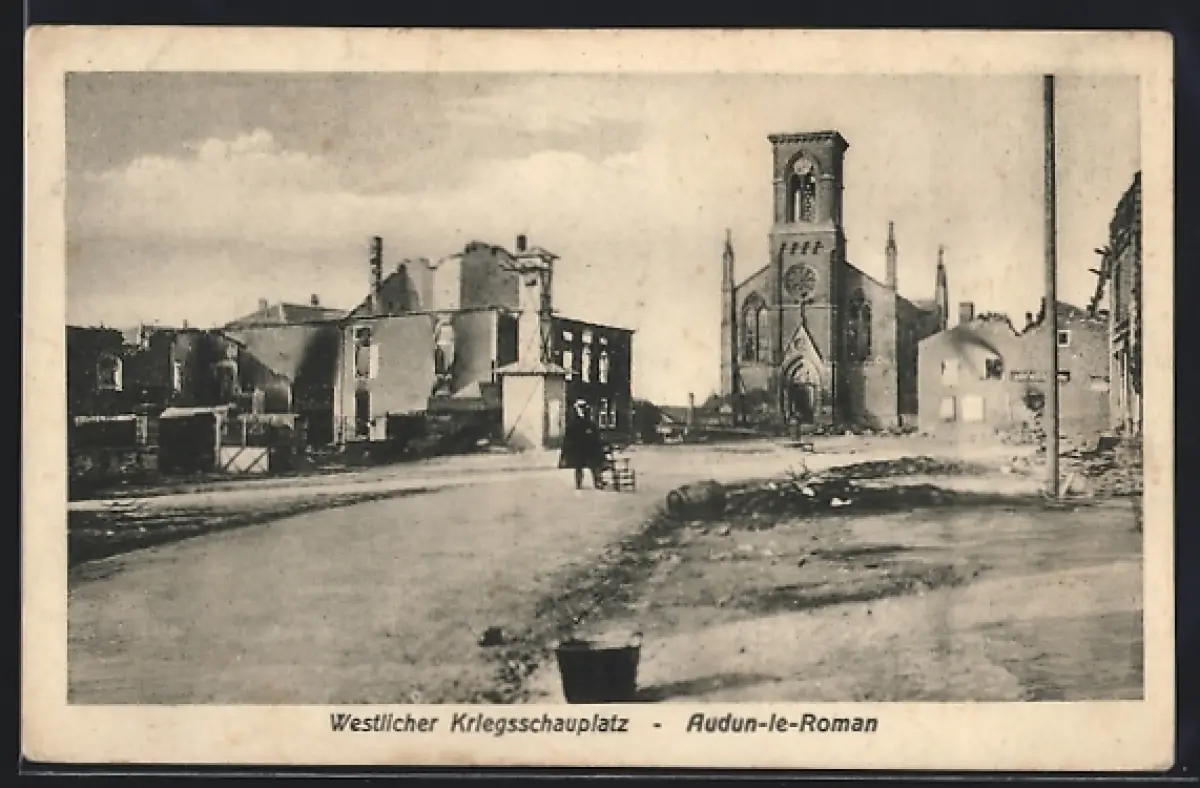 AK Audun-le-Roman, Westlicher Kriegsschauplatz, Strassenpartie mit zerstörten Häusern