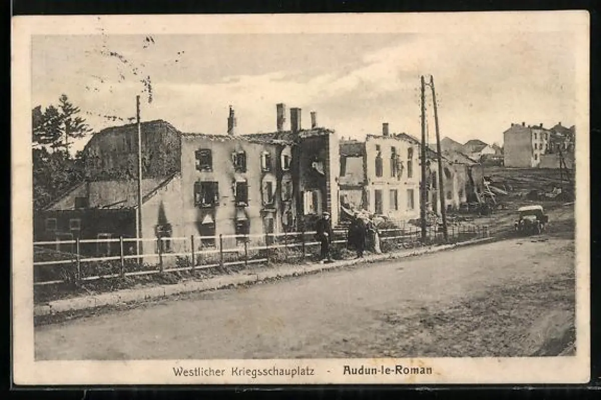 AK Audun-le-Roman, Westlicher Kriegsschauplatz, Strassenpartie mit zerstörten Häusern