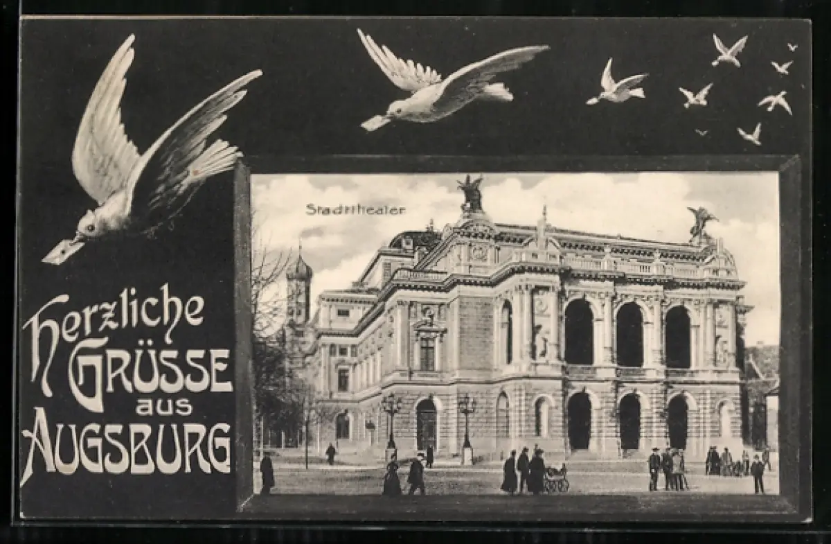 AK Augsburg, Ansicht des Stadttheaters, Brieftauben