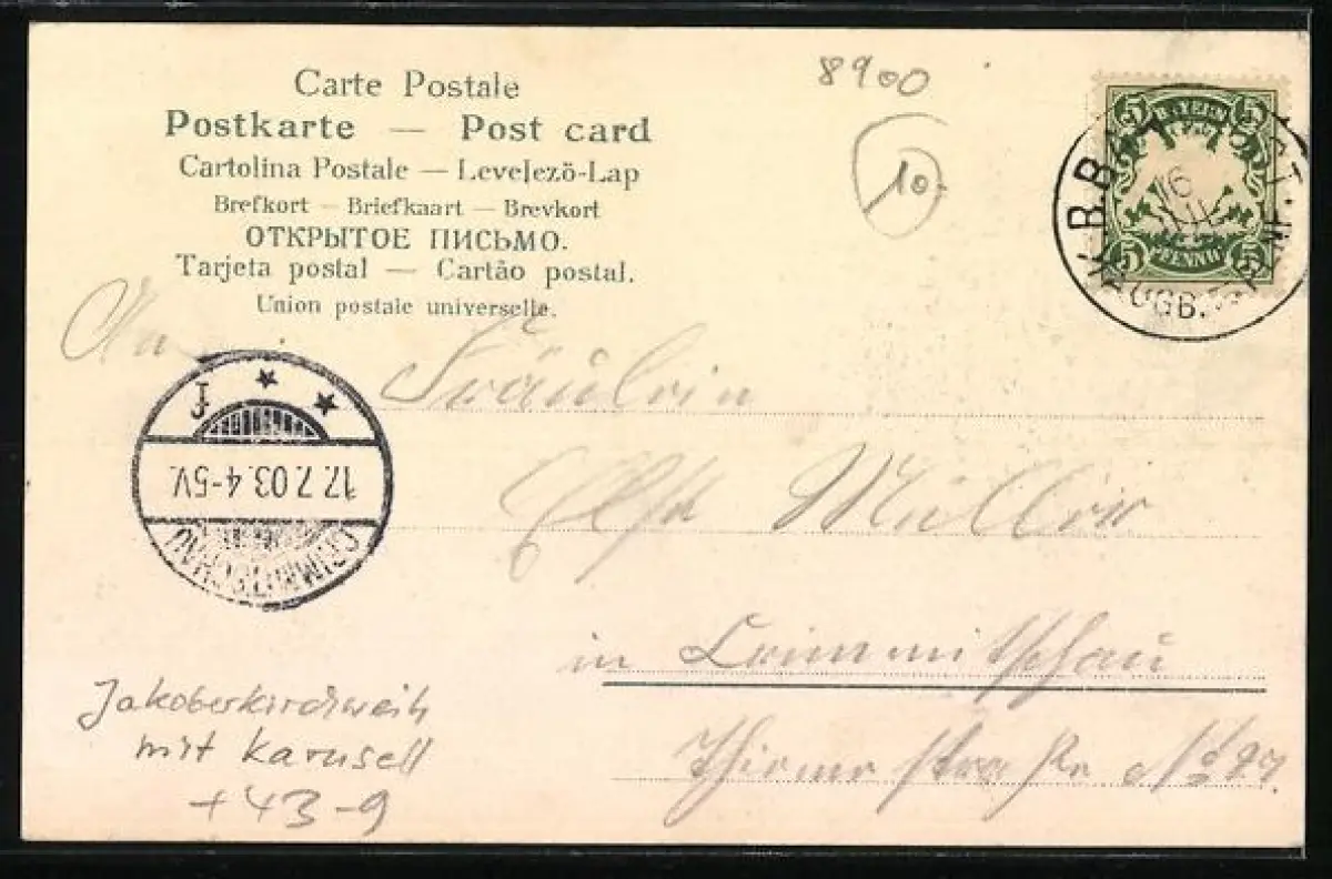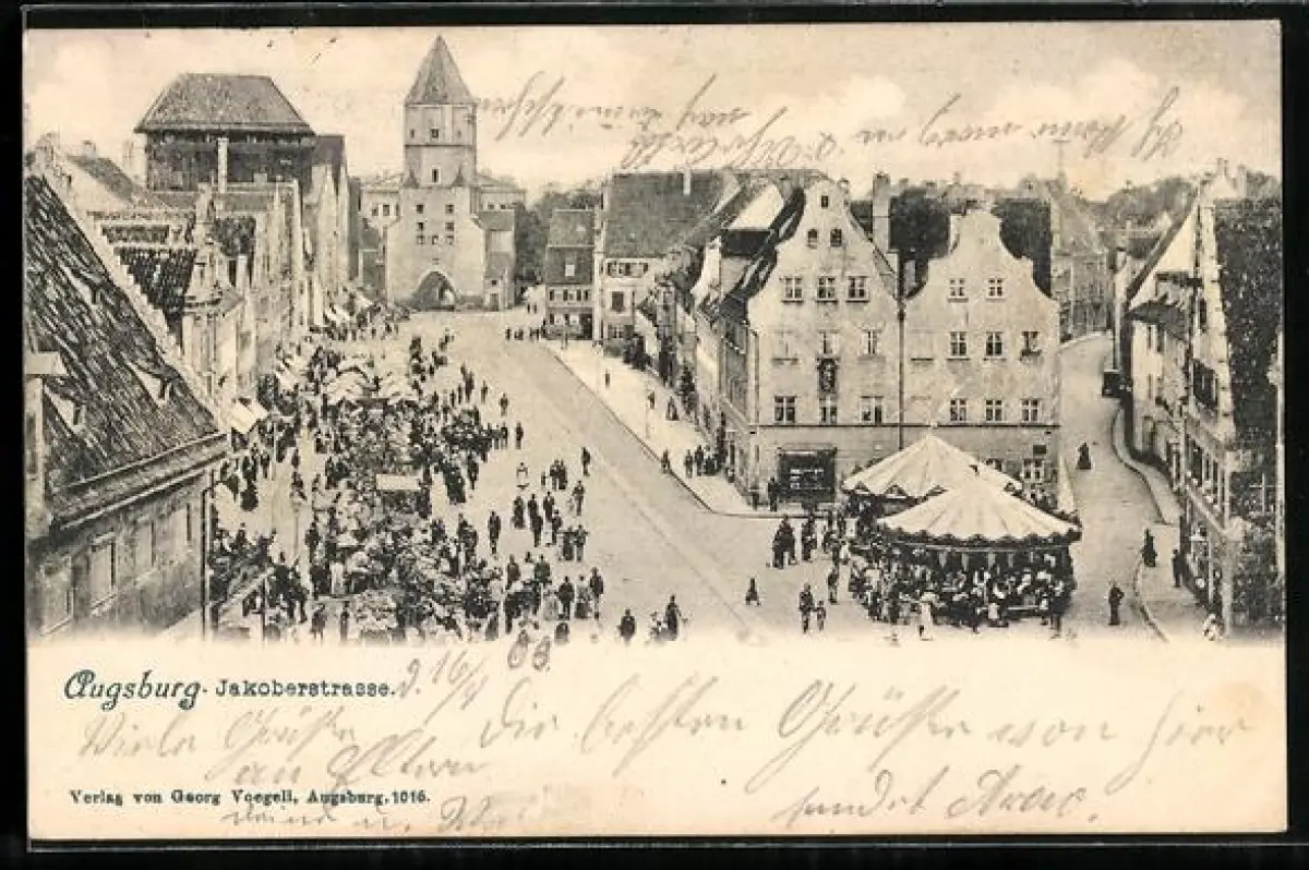 AK Augsburg, Jakoberstrasse zur Jakoberkirchweih mit Karussell