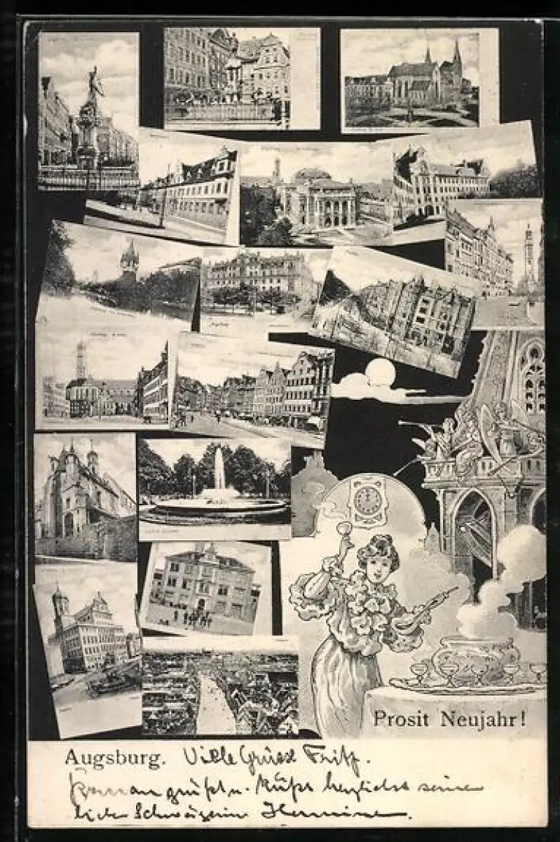 AK Augsburg, Kirche, Denkmal, Brunnen, Neujahrsgruss