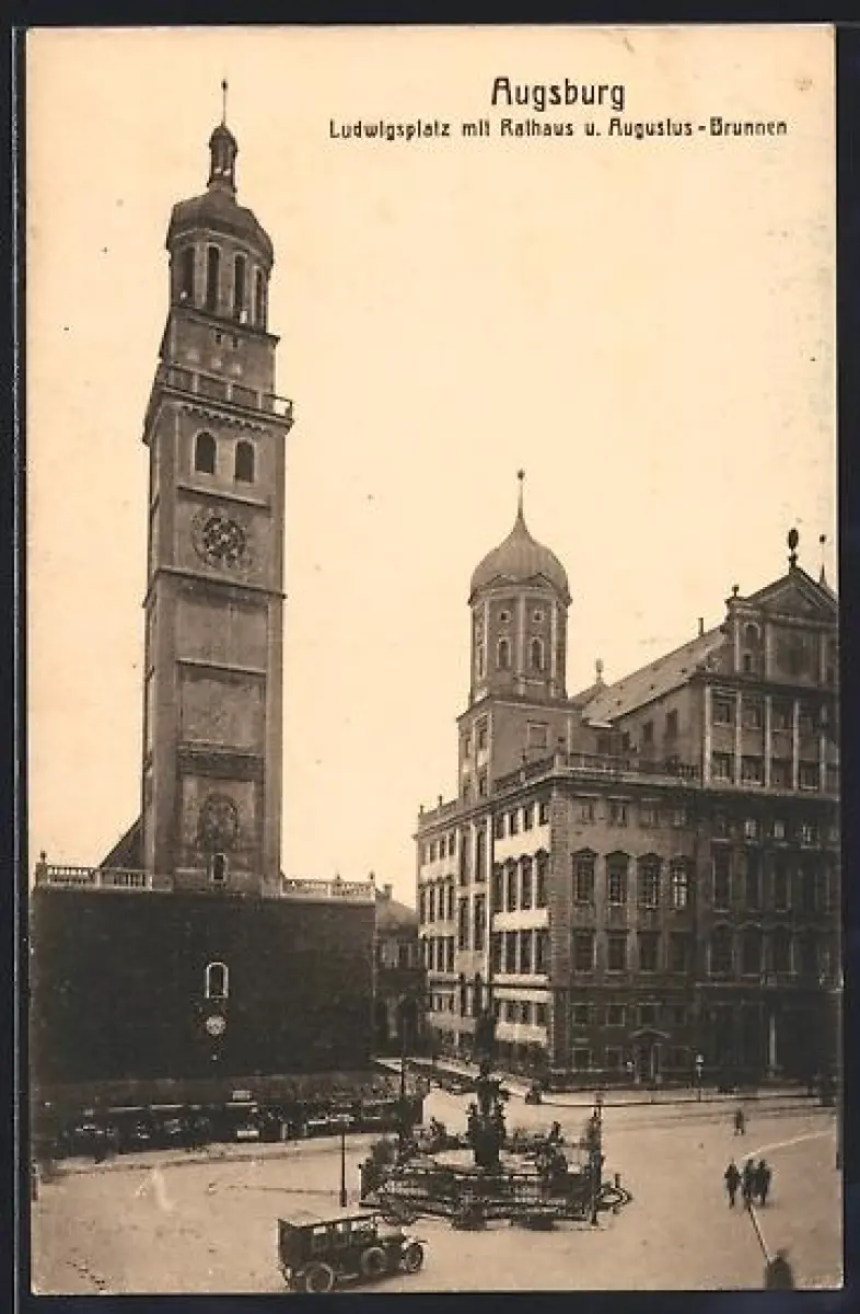 AK Augsburg, Ludwigsplatz mit Rathaus u. Augustus-Brunnen